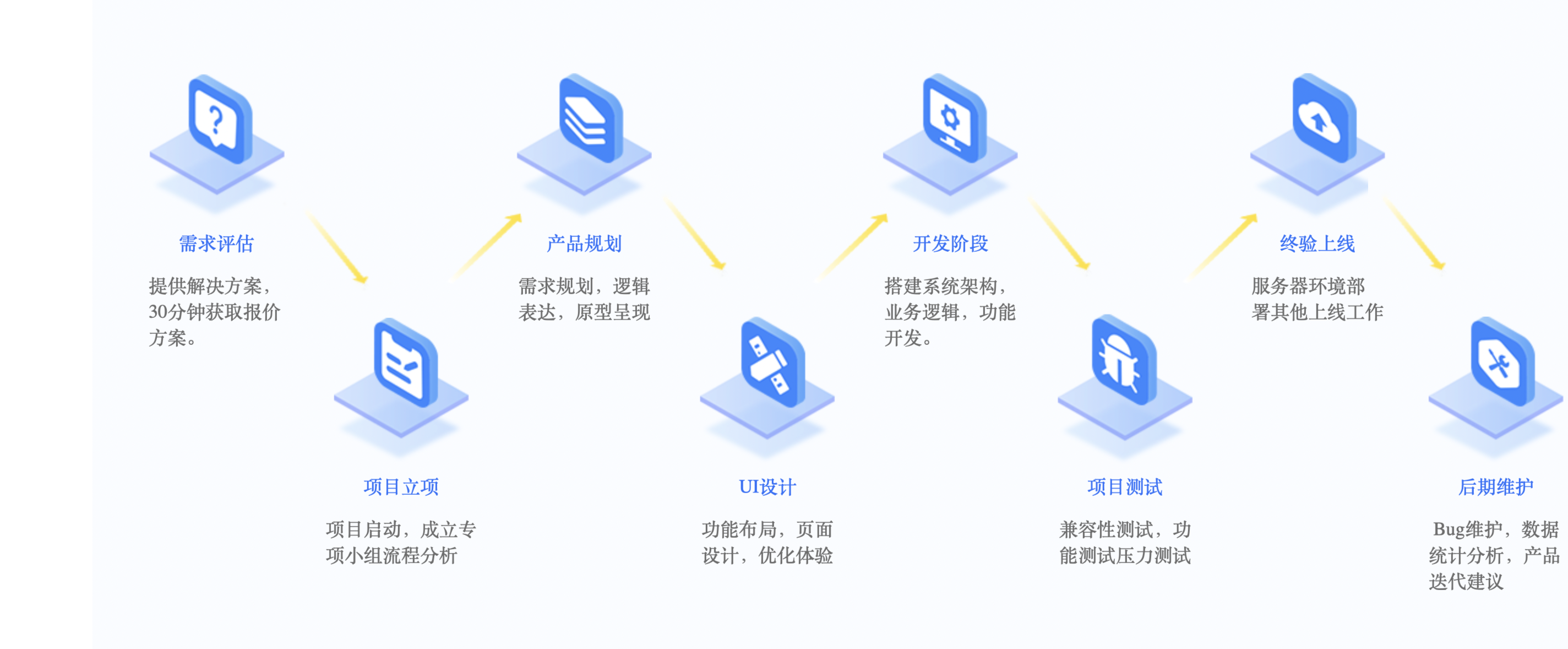 經(jīng)過大量APP開發(fā)項目的經(jīng)驗積累,以 及自身對互聯(lián)網(wǎng)領(lǐng)域商業(yè)模式的了解, 可以為每一位客戶提供專業(yè)性的建議及 產(chǎn)品方案,合理周全的考慮到客戶的需 求和盈利模式,為您的項目成功保駕護(hù) 航。
